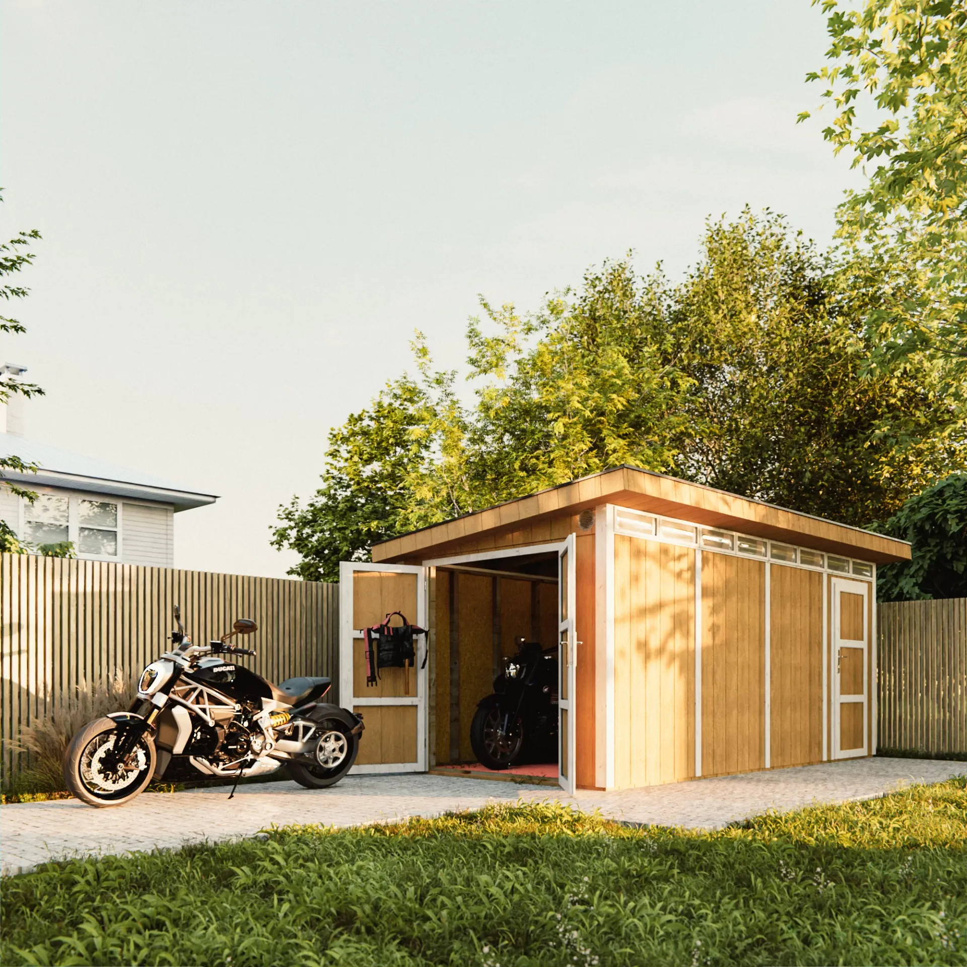 Casetta da giardino moderna e minimalista LP® SmartSide® – ideale per riporre in modo ordinato e pratico attrezzi da giardino, biciclette, piccoli utensili o giochi per bambini.
