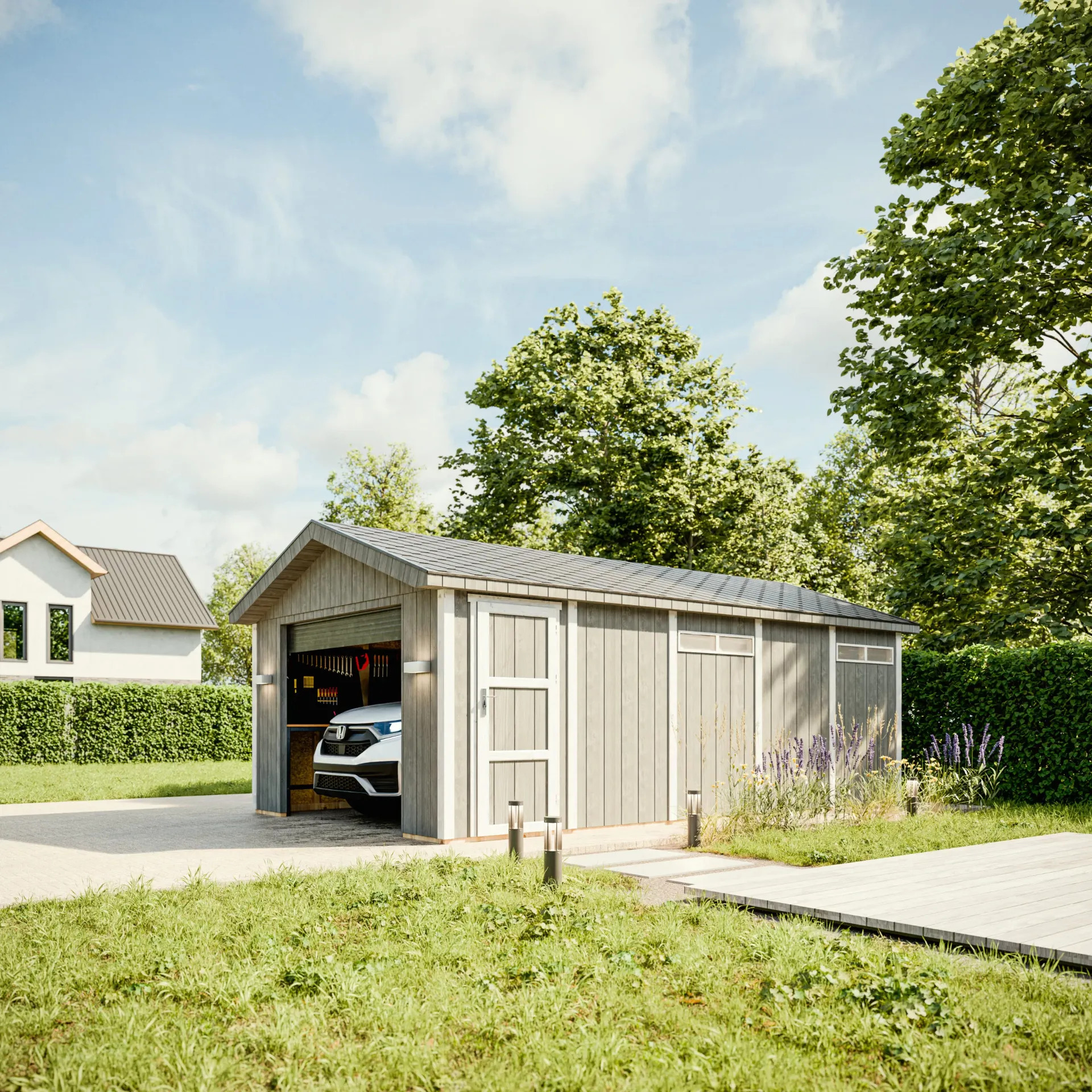Opzioni di copertura del tetto: Il garage include una copertura bituminosa standard, ma è disponibile anche un set di tegole bituminose per una maggiore protezione dagli agenti atmosferici.